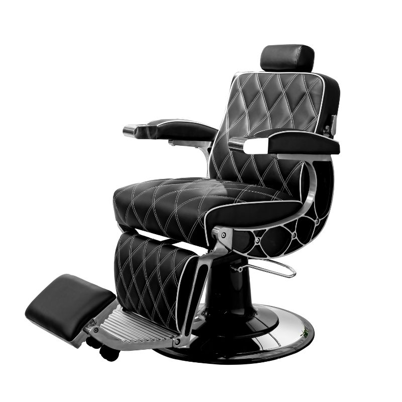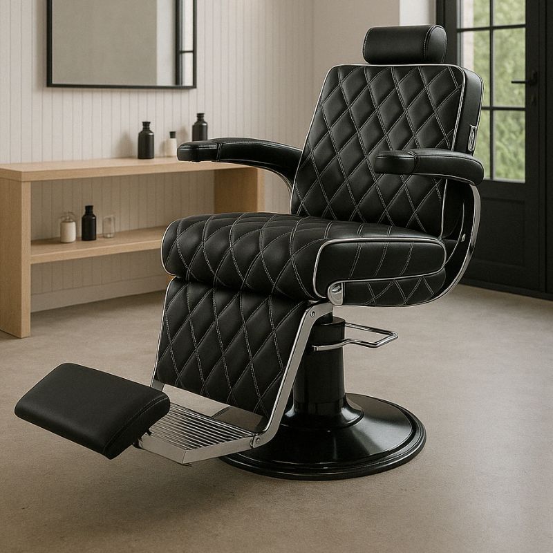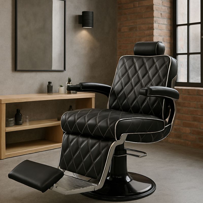 A Cadeira de Barbeiro Nevada combina um design sofisticado com funcionalidades premium, oferecendo conforto e praticidade tanto para o cliente quanto para o barbeiro. Seu estofamento preto com costura diamantada e detalhes cromados conferem um visual luxuoso, ideal para barbearias modernas e elegantes.