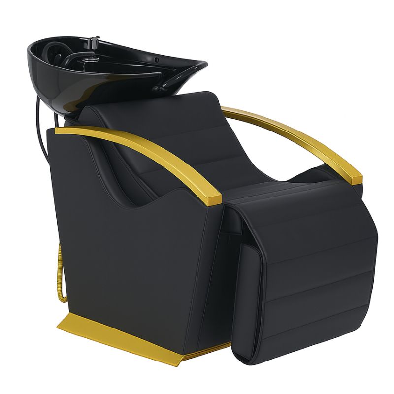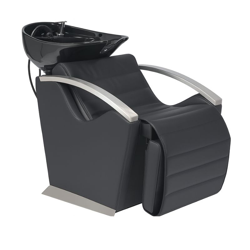 Lava Cabeças Solace com revestimento em pele microfibra, lavatório em cerâmica preta e base em plástico reforçado. Apoio de braço confortável em silicone e tubos de água com sistema anti-gota.