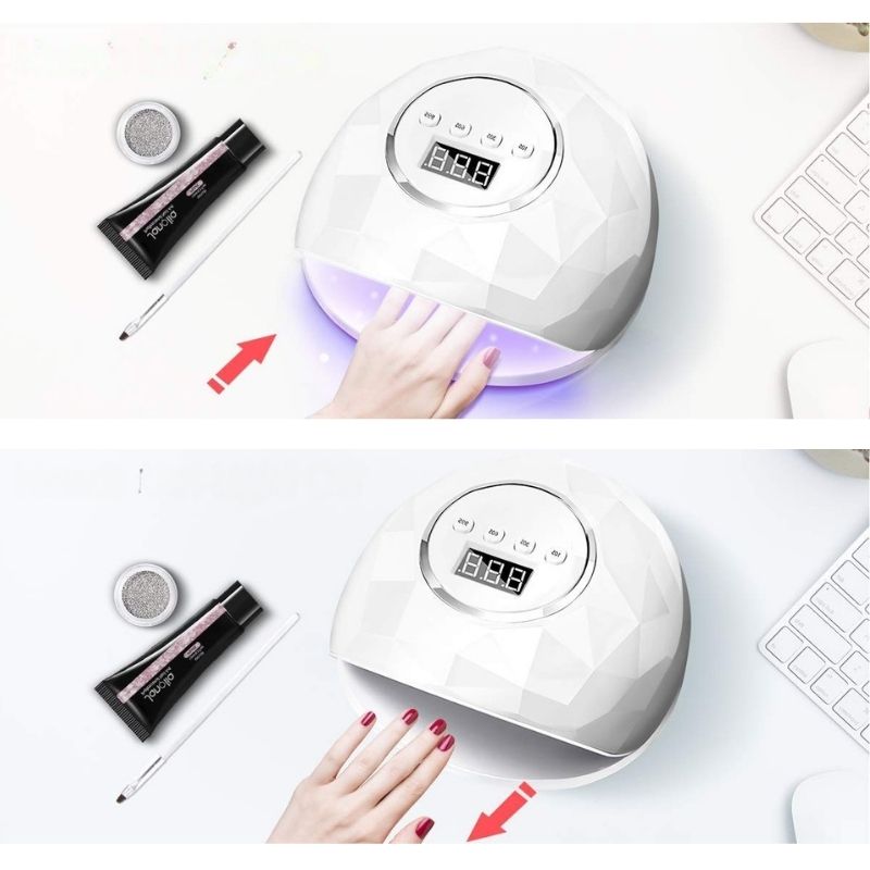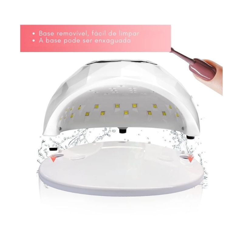 Lâmpada profissional com sensor automático e temporizadores de 10s, 30s e 60s. Ideal para secagem rápida de gel UV/LED. Liga-se automaticamente ao detetar a mão e desliga após 120 segundos.