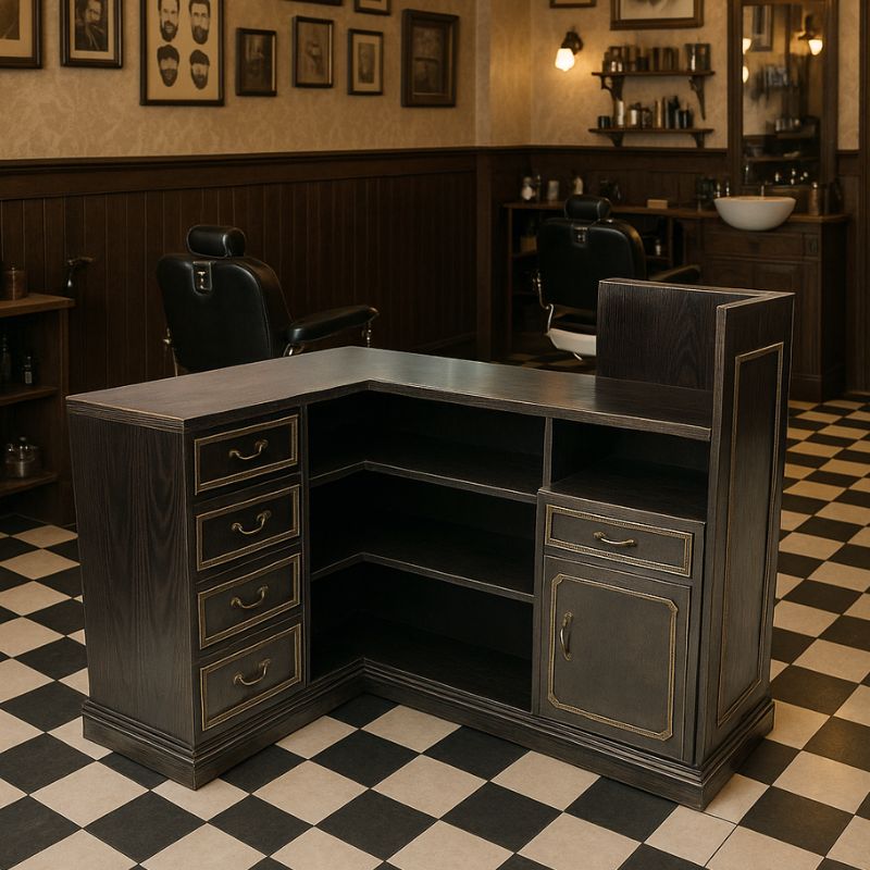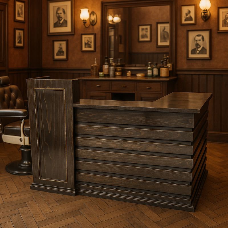 Dê um toque de sofisticação e requinte à sua barbearia com esta elegante receção em madeira escura, trabalhada com um acabamento rústico e detalhes clássicos. Ideal para quem deseja impressionar desde o primeiro contacto com o cliente, este balcão destaca-se pela sua construção robusta e pelo design intemporal.
