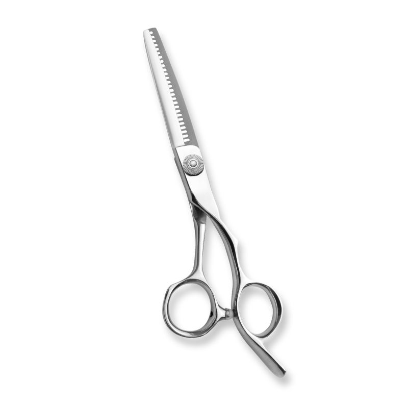 Tesoura debastadora, com lâmina invertida estilo europeu em aço inoxidável com corpo, parafuso prateado e amortecedor transparente. Embalagem SK5071